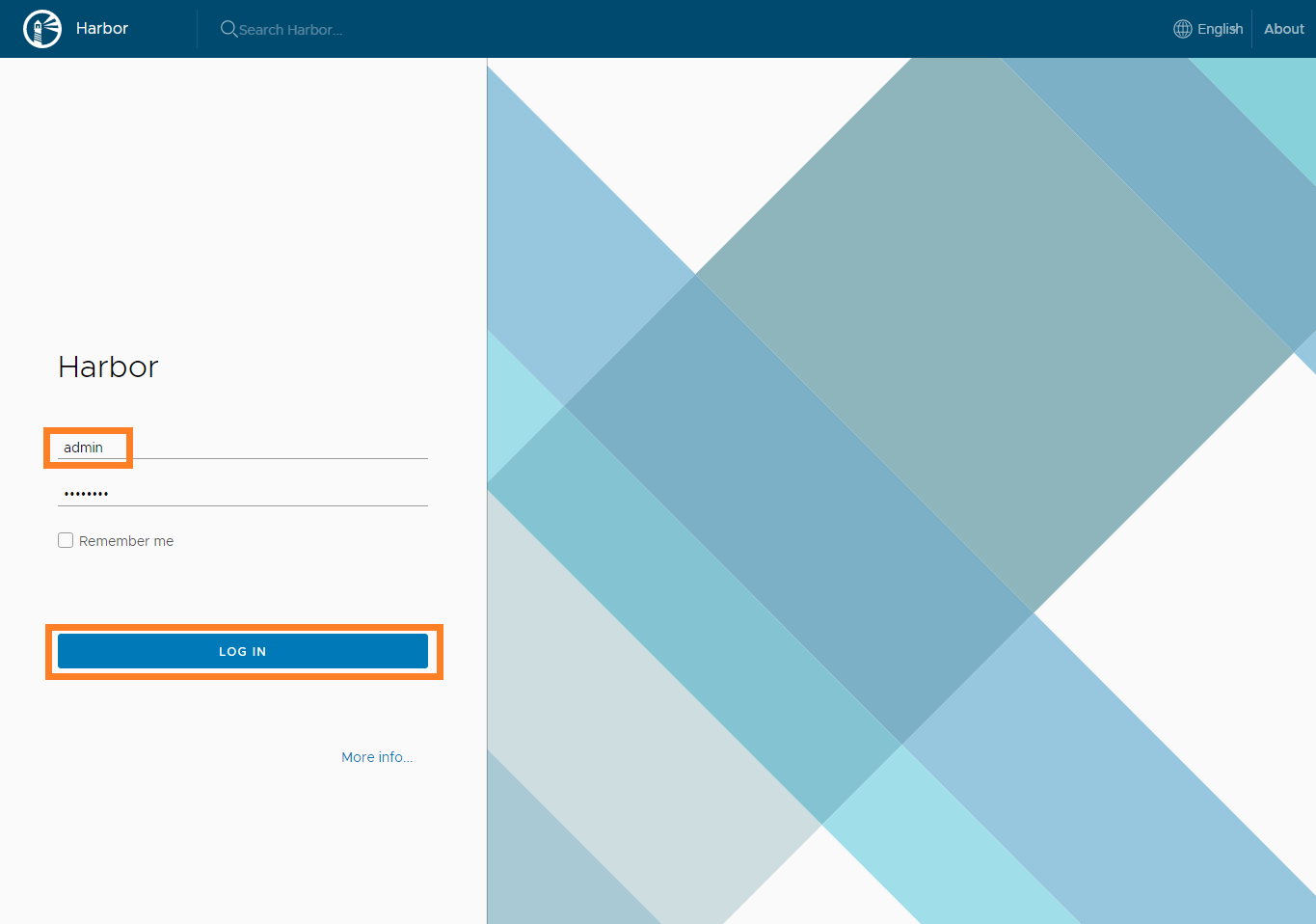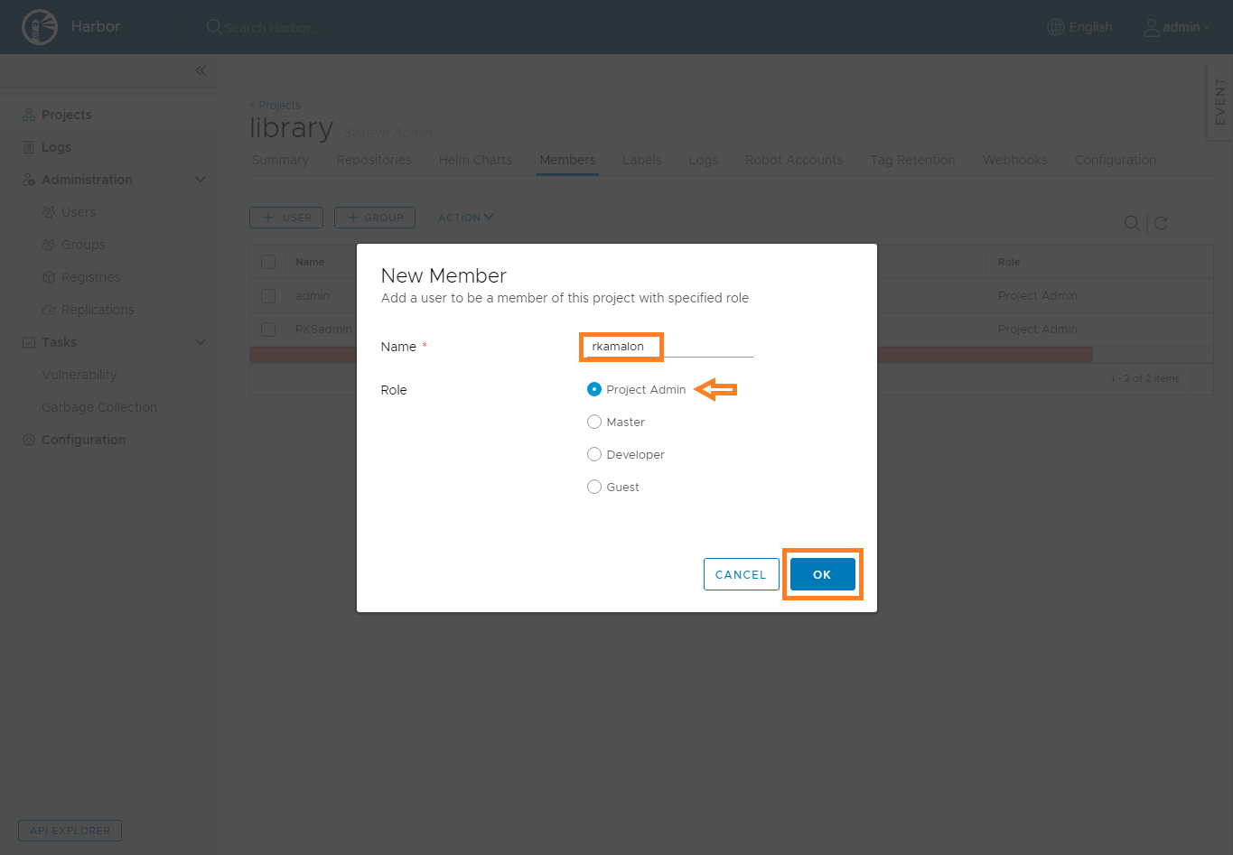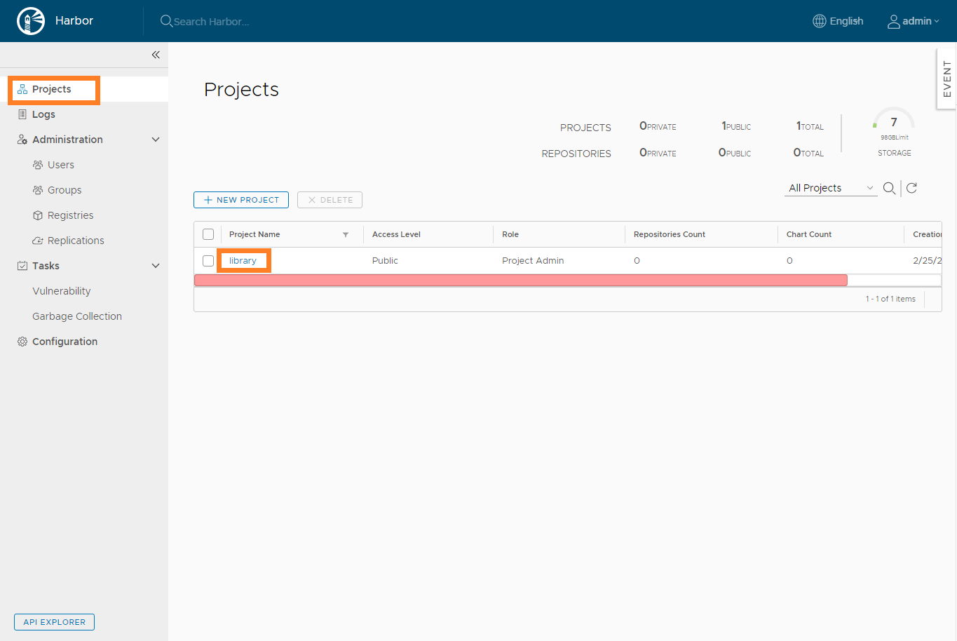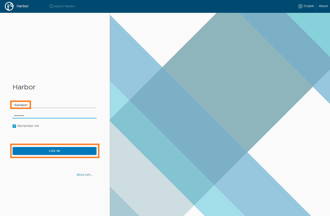 Once the harbor vm is installed successfully, login to the GUI by going to https://harbor-fqdn, use the default admin user to login.