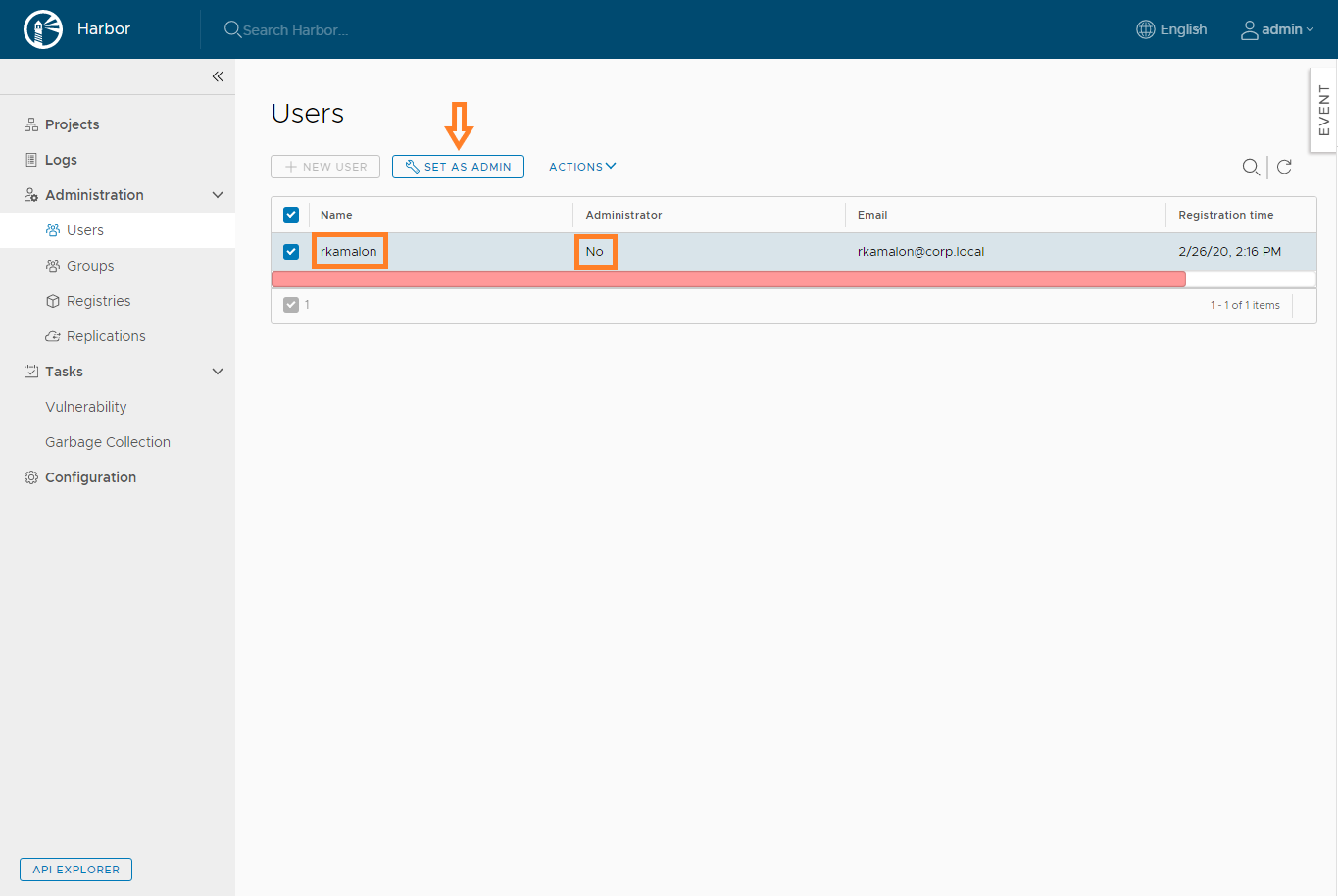 Select the user and click on SET AS ADMIN to give it admin rights.
