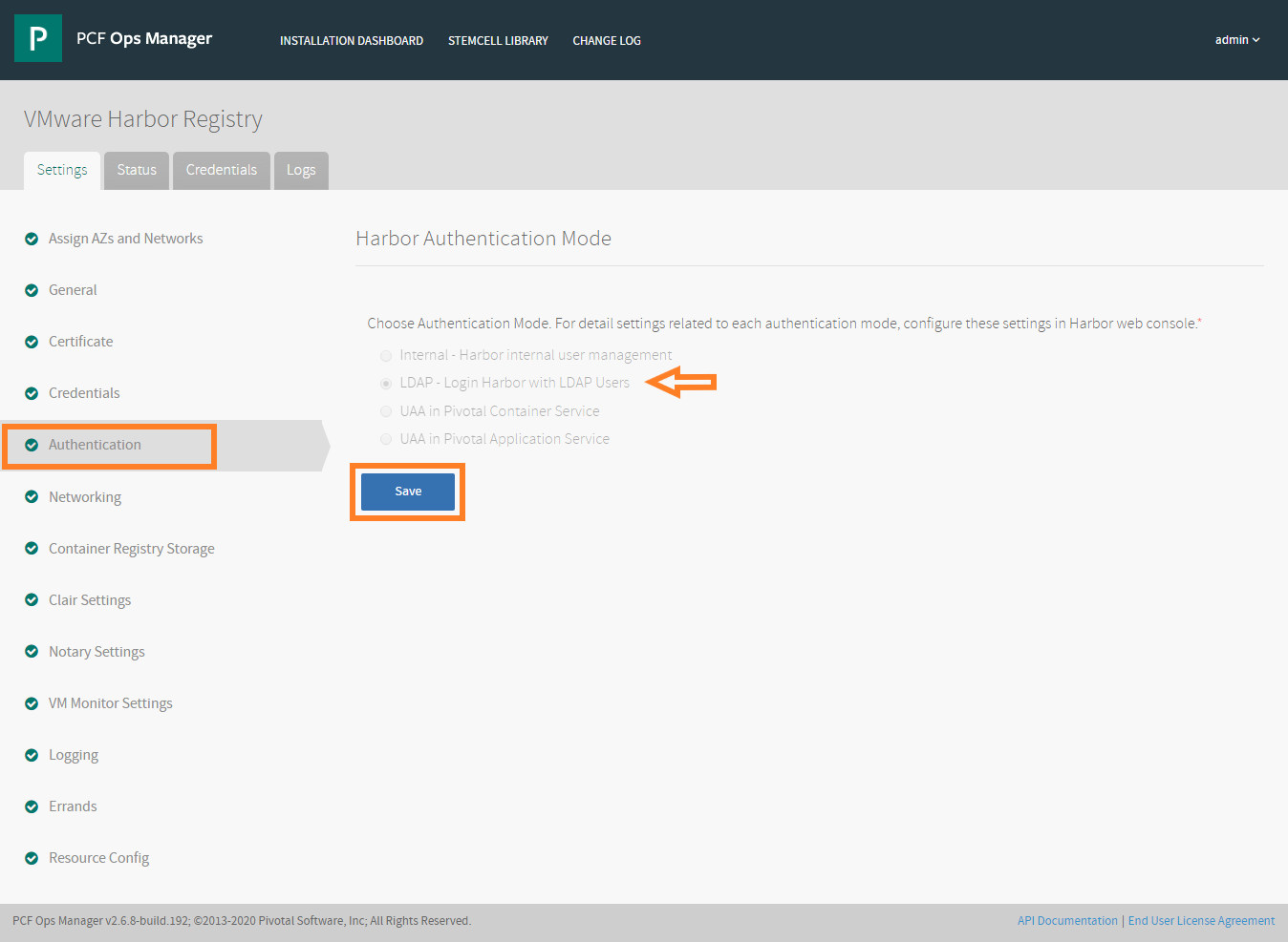 Note: Authentication mode in harbor can only be updated during initial installation. To change this, you will have to re-install the harbor vm.
